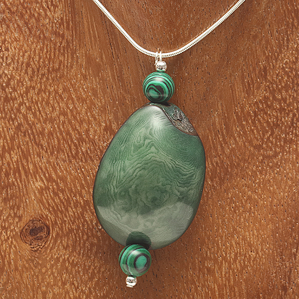 20" Sterling Silver Snake Chain & Head-Pin, 3 Round Malachite beads in 2 sizes, 1 Green Coloured Thick Slice Tagua Nut Central bead. |