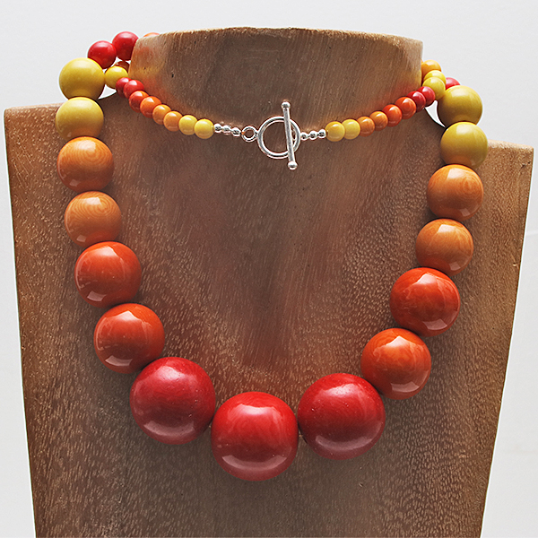 63 Round Tagua Seed beads in 7 sizes; Yellow, Saffron, Orange and Red colours. Strung on Gold Coloured Flexi Beading Wire, plus Sterling Silver Toggle Clasp, Crimp beads & Crimp Covers. |