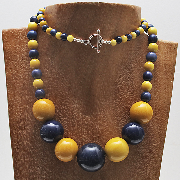 75 Round Tagua Seed beads in 5 sizes; Yellow and Blue colours. Strung on Black Coloured Flexi Beading Wire, plus Sterling Silver Toggle Clasp, Crimp beads & Crimp Covers. |