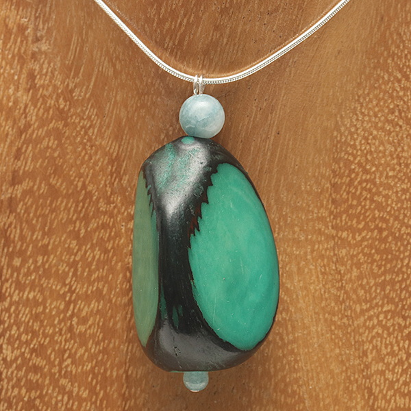 20" Sterling Silver Snake Chain, Head-Pin & 2 Spacer beads, 2 Round Chrysocolla beads, 1 Green Coloured Flattened Tagua Nut Central bead. |