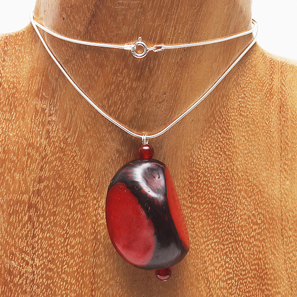 20" Sterling Silver Snake Chain & Head-Pin, 2 Saffron Coloured Tiny Round Tagua Seed bead, 1 Dark Red Coloured Tagua Seed Donut Central bead, 2 Red Coloured Large Round Tagua Seed bead |