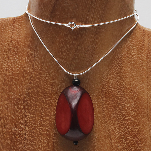 20" Sterling Silver Snake Chain & Head-Pin, 3 Round Jett beads in 2 sizes, 1 Dark Red Coloured Thick Slice Tagua Nut Central bead. |