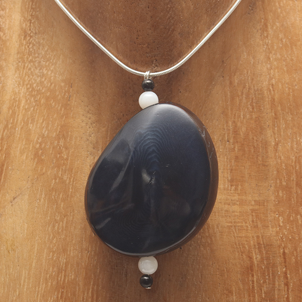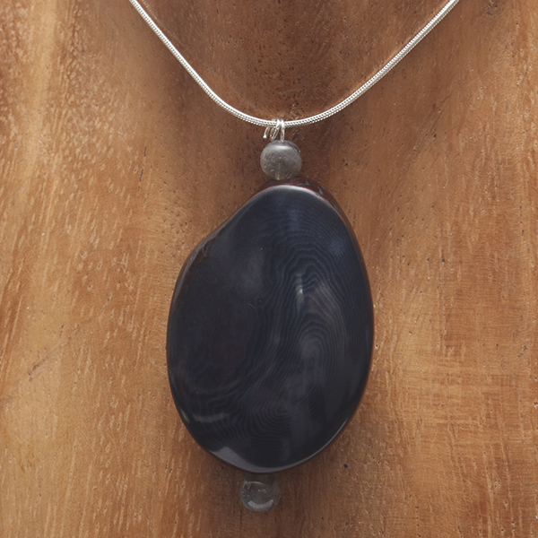 20" Sterling Silver Snake Chain & Head-Pin, 2 Small Round Labradorite beads, 1 Indigo Coloured Flattened Tagua Nut Central bead. |
