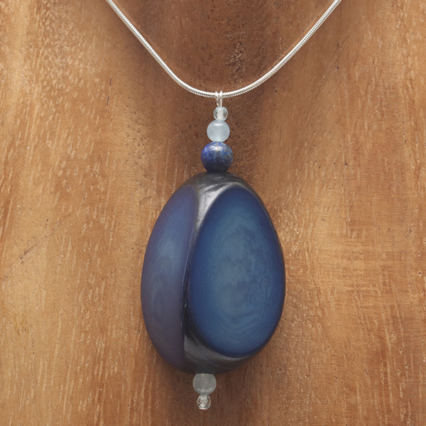 20" Sterling Silver Snake Chain & Head-Pin, 2 Tiny Round Topaz beads, 2 Small Round Aquamarine beads, 1 Round Lapis Lazuli with Pyrite bead. 1 Blue Coloured Triangle Tagua Nut Central bead. |