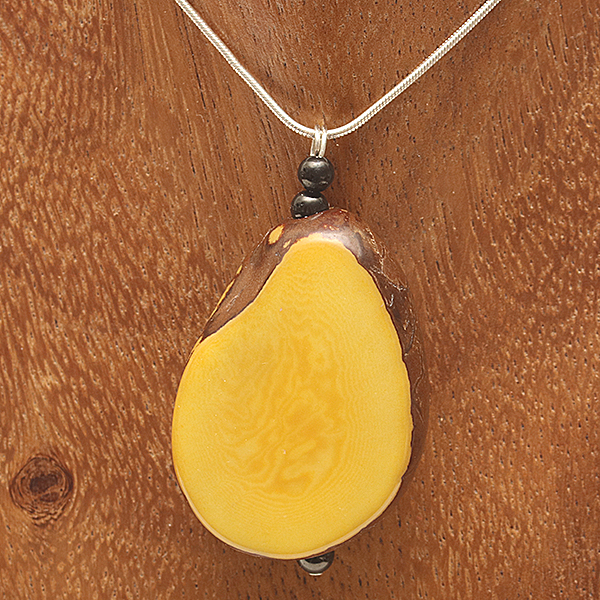 20" Sterling Silver Snake Chain & Head-Pin, 2 Yellow Coloured Tiny Round Tagua Seed bead, 1 Aqua Coloured Tagua Seed Donut Central bead, 2 Yellow Coloured Large Round Tagua Seed bead |