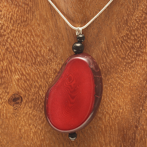 20" Sterling Silver Snake Chain, Sterling Silver Crimp bead and Ring, Red Coloured Copper Beading Wire, 3 Round Jett beads, 2 Red Coloured Small Round Tagua Seed beads, 1 Red Coloured Heart Shaped Tagua Seed Central bead. |
