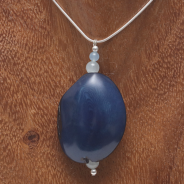 20" Sterling Silver Snake Chain & Head-Pin3 Round Aquamarine beads in 2 sizes, 1 Blue Coloured Flattened Tagua Nut Central bead. |