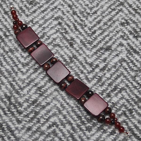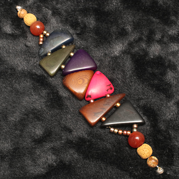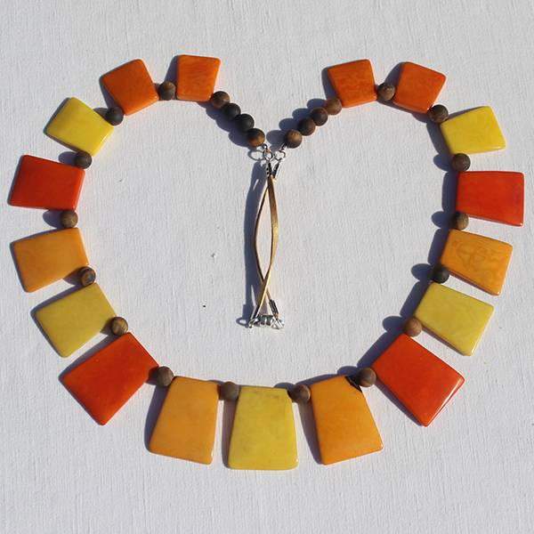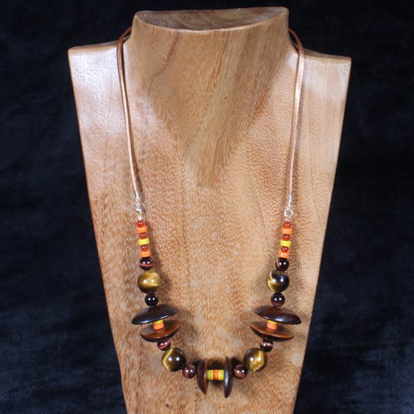 6 Faceted Red Tigers Eye beads, 6 Saffron & Orange Round Tagua Seed beads, 3 Yellow to Wine Coloured Thick Slices of Tagua Seed beads. Strung on Gold Coloured Flexi Beading Wire, plus Sterling Silver Toggle Clasp, Split Rings, Cord Ends & Crimp beads, finished with Copper Coloured Leather Cord endings. |