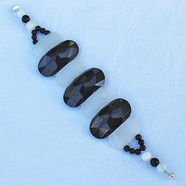 Sterling Silver Magnetic Clasp & Crimp beads, White Coloured Flexi Beading Wire, 2 Mother of Pearl beads, 14 Round Jett beads in 2 sizes, 4 Calcedony-Quartz Disc beads, 3 Vintage Victorian Faceted Whitby Jett beads. |