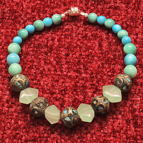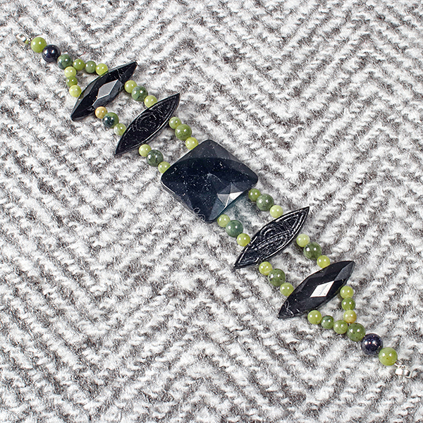 Sterling Silver Magnetic Clasp & Crimp beads, Acrylic Beading Thread, 40 Green Jade beads, 2 Blue Goldstone beads, 5 Faceted Old Jett beads. |