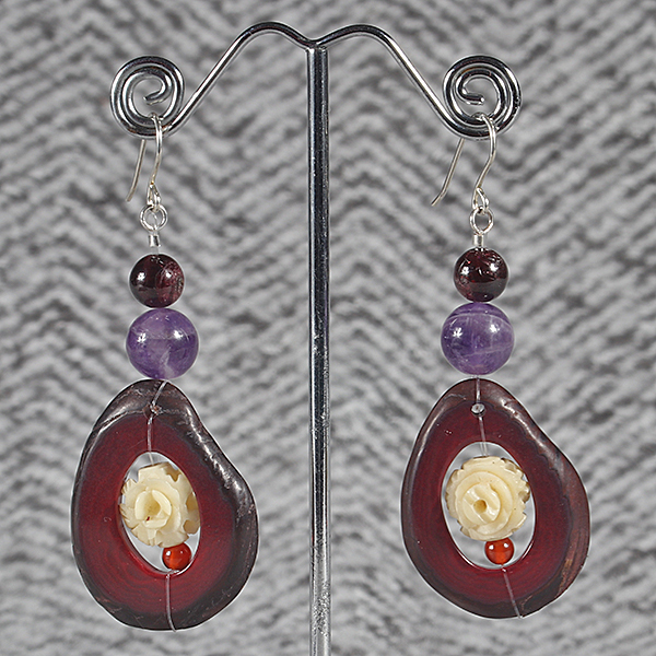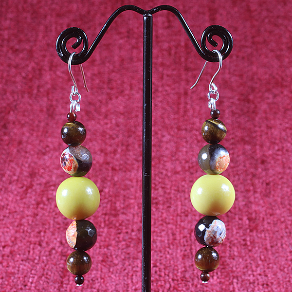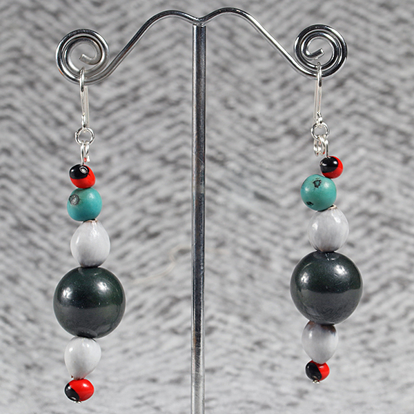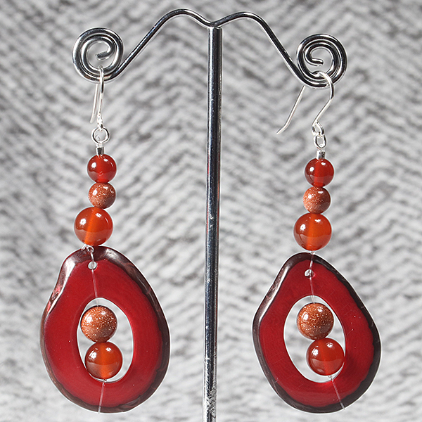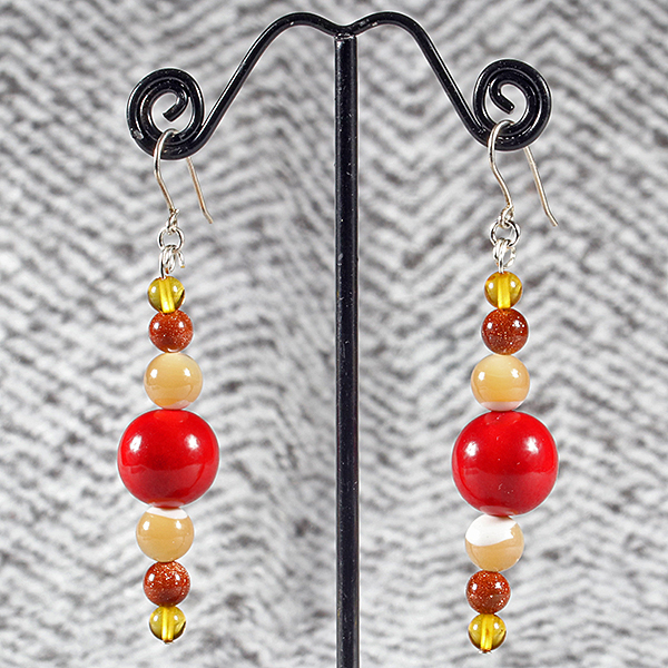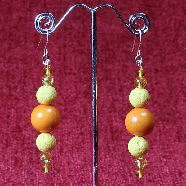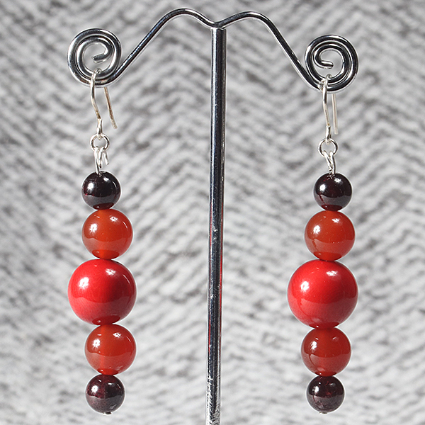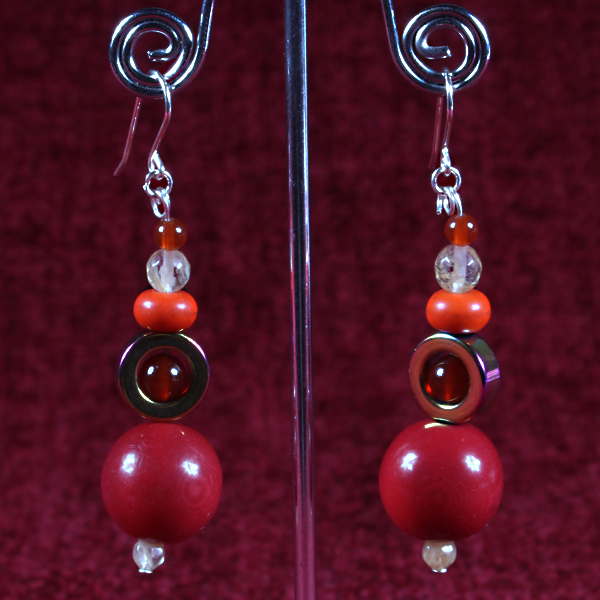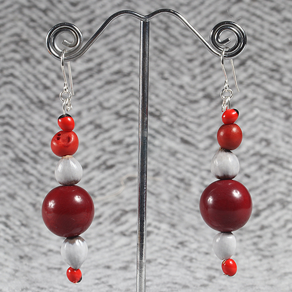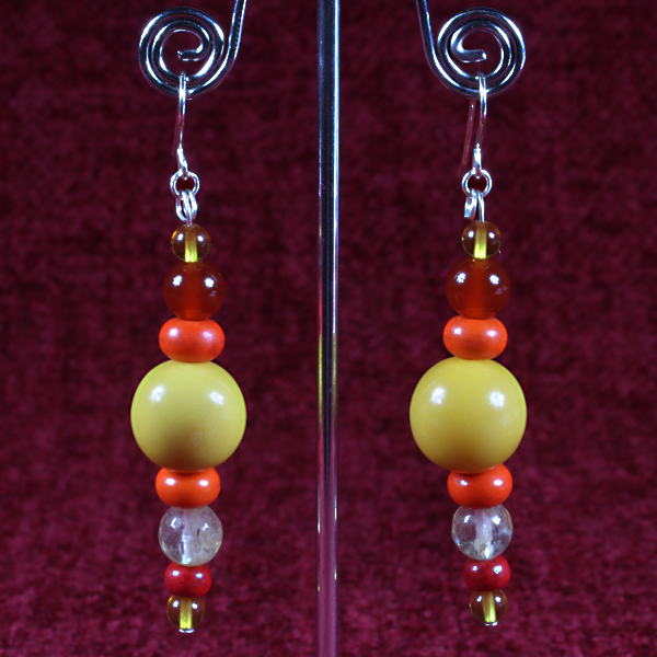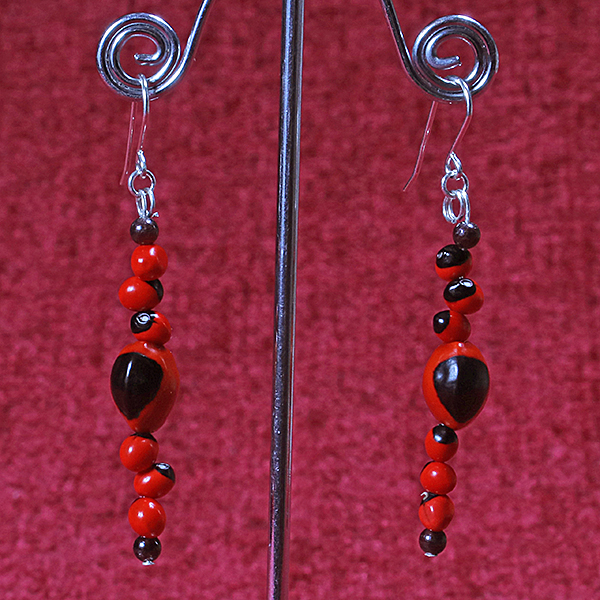 Sterling Silver Ear-hooks, Rings & Head Pins; 7 Tiny Round Amber beads; 6 Tiny Round Tagua Seed beads in: Yellow, Orange, Red and Dark Red colours. |