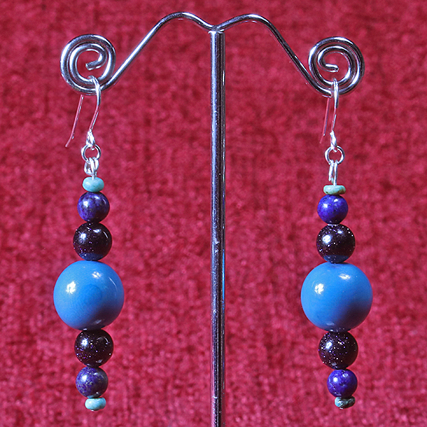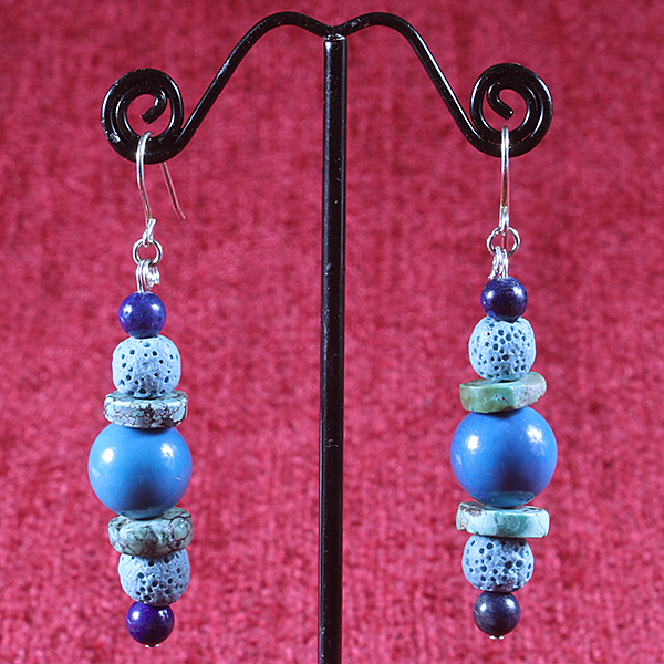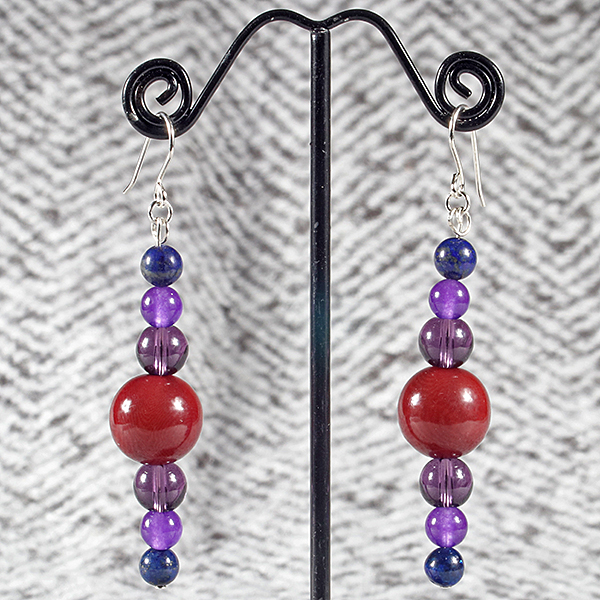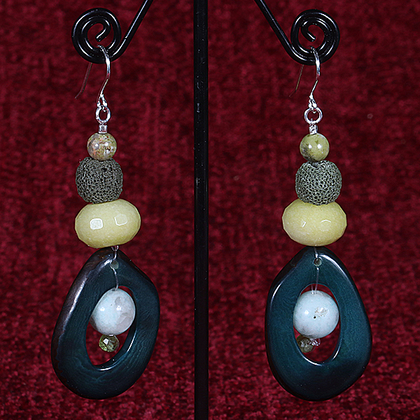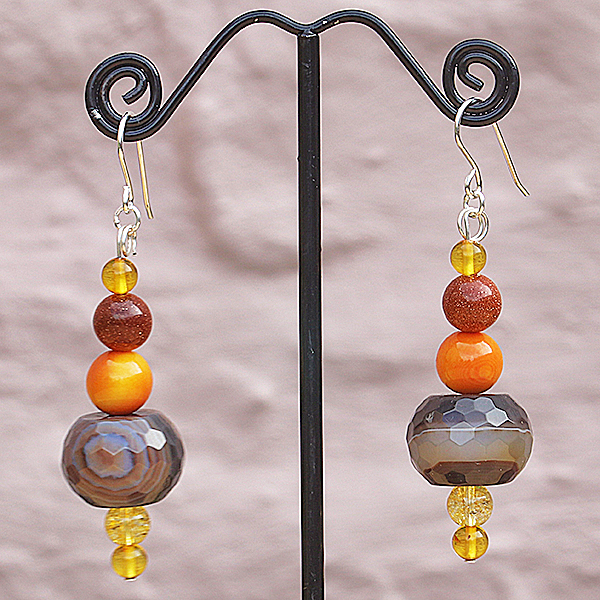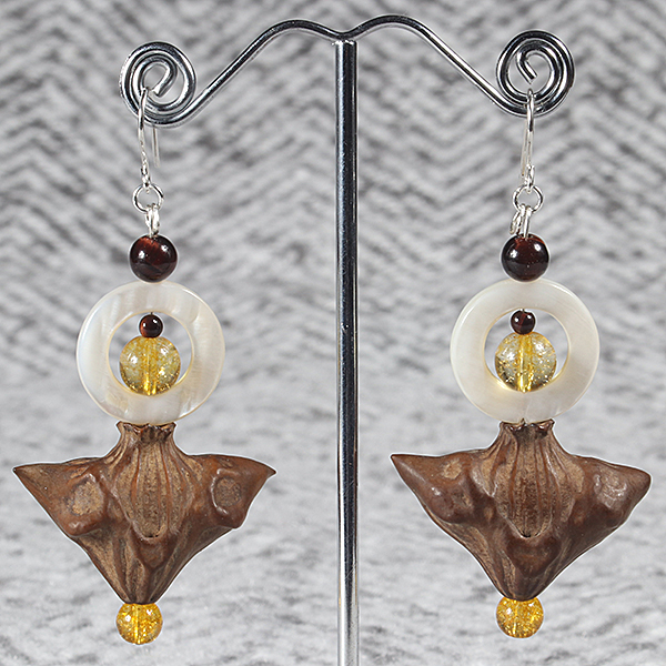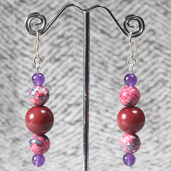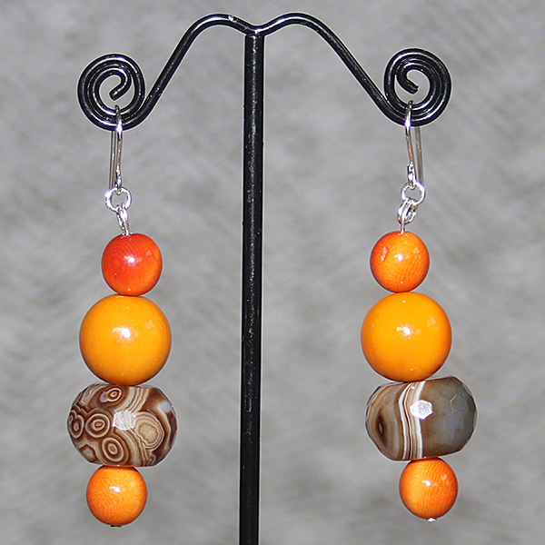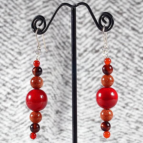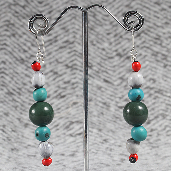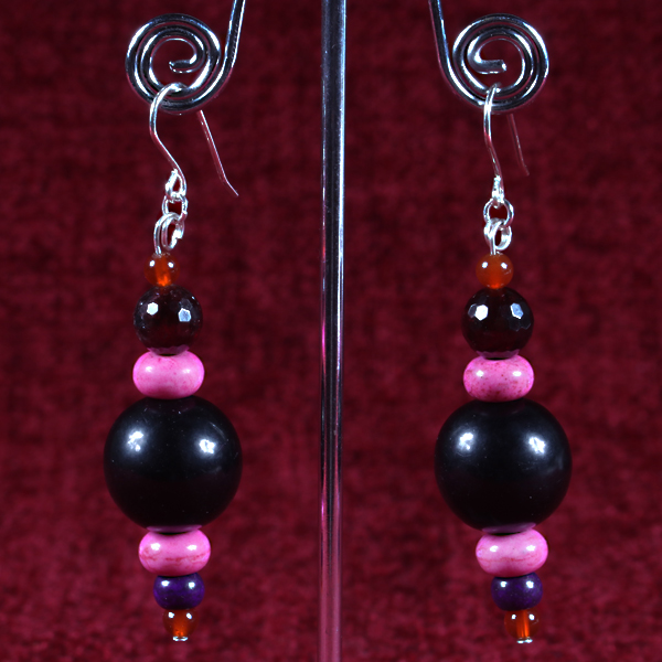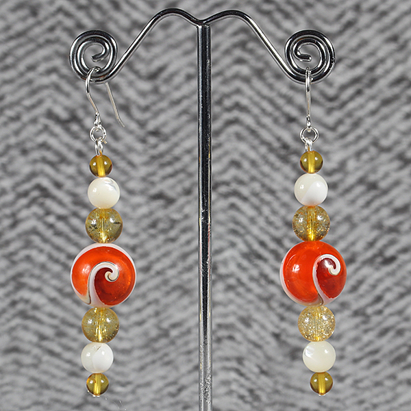 Sterling Silver Ear-hooks, Rings & Head Pins; 7 Tiny Round Amber beads; 6 Tiny Round Tagua Seed beads in: Yellow, Orange, Red and Dark Red colours. |