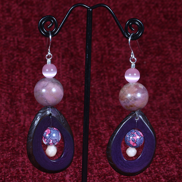 Sterling Silver Ear-hooks, Rings Head Pins & 3 Spacer beads, 1 Rhodonite Flower Shaped Central bead. |