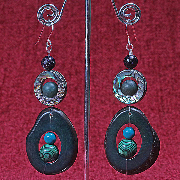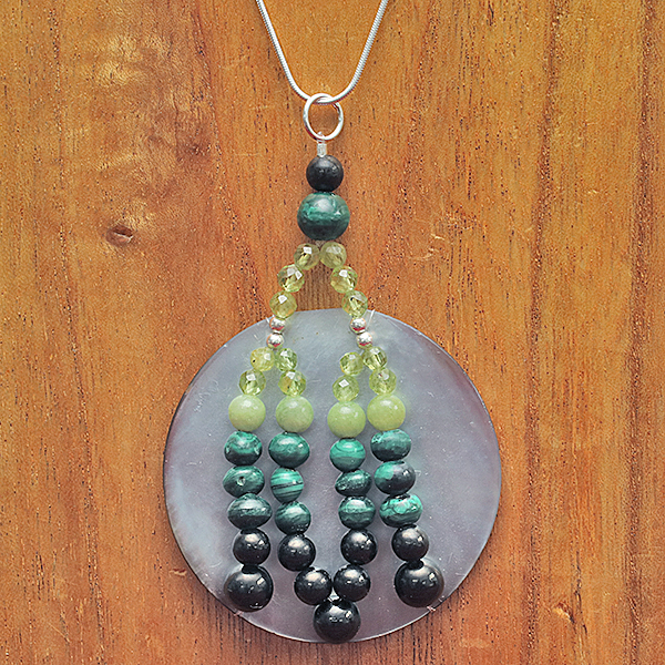 20" Sterling Silver Snake Chain, Sterling Silver Crimp bead, Ring, and 15 Spacer beads, Acrylic Beading Thread, 11 Jett beads, 13 Malachite beads, 18 Peridot beads, 1 Up-cycled Shell Circle Central bead. |