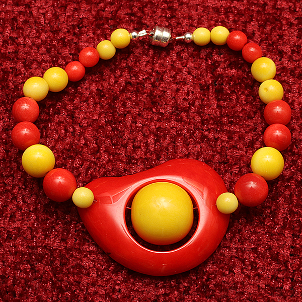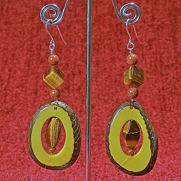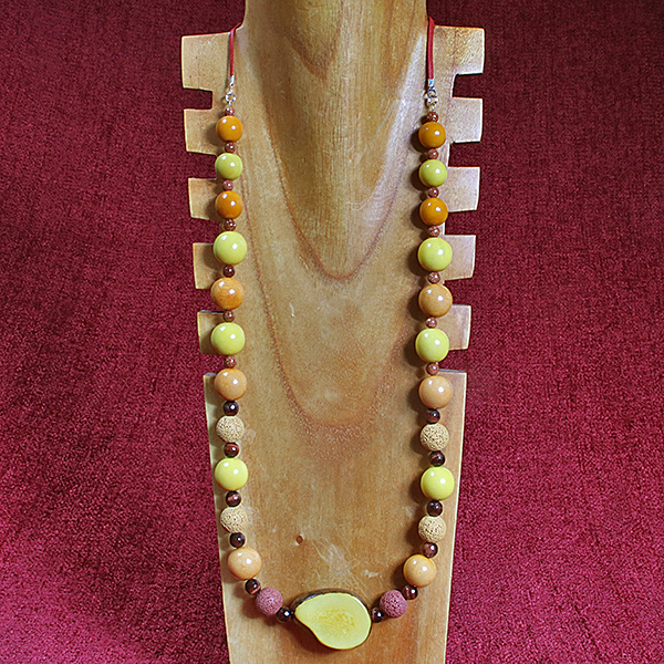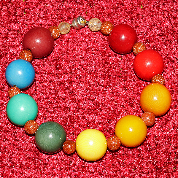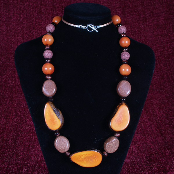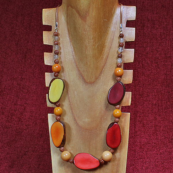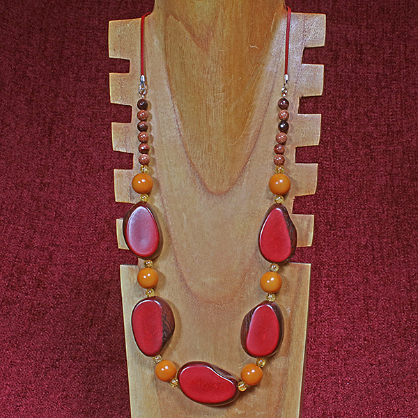 14 Goldstone beads, 18 Saffron/Yellow Rounded Tagua Seed beads, 12 Faceted Red Tigers Eye beads, 6 Lava beads, Yellow Thick Slice of Tagua Seed Central bead. Strung on Gold Coloured Flexi Beading Wire, plus Sterling Silver Toggle Clasp, Split Rings, Cord Ends & Crimp beads, finished with Red Coloured Leather Cord endings. |