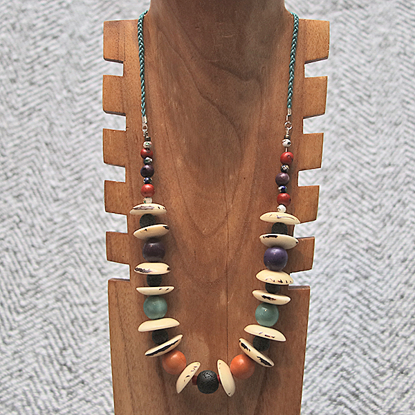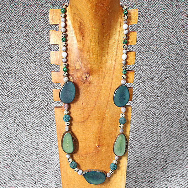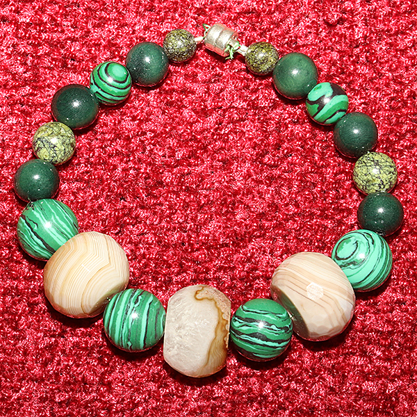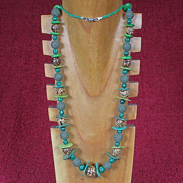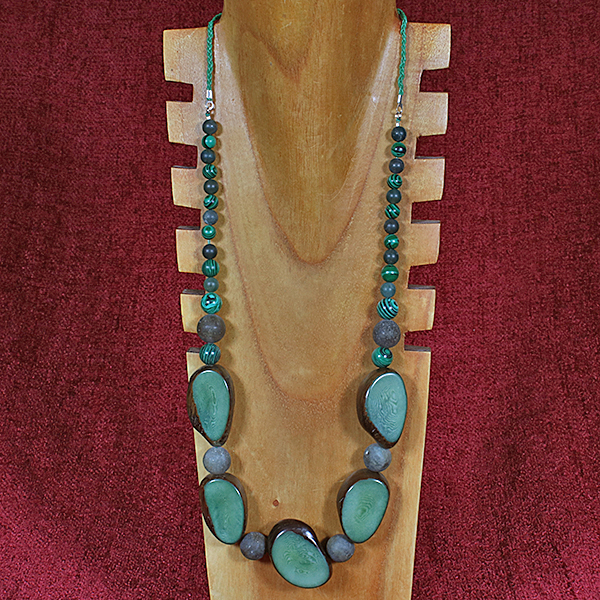 24 Malachite beads, 42 Imfibinga Seeds, 6 Green Round Tagua Seed beads, 6 Green Round Tagua Seed beads, 1 Green Thick Slice of Tagua Seed Central bead. Strung on Green Flexi Beading Wire, plus Sterling Silver Magnetic Clasp, Split Rings, Cord ends & Crimp beads. |