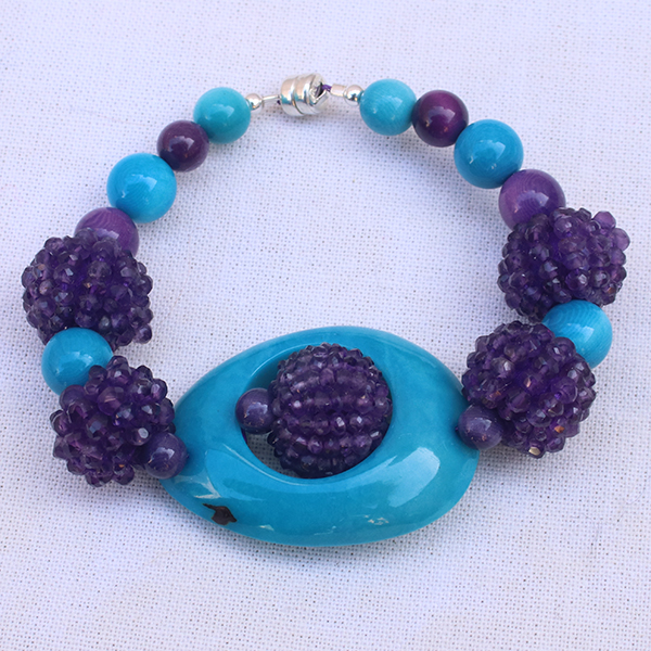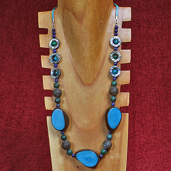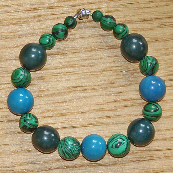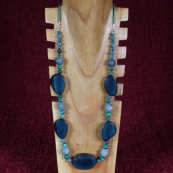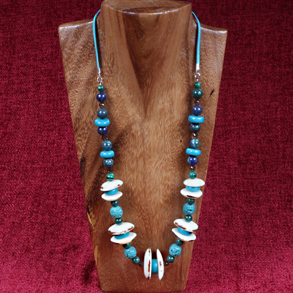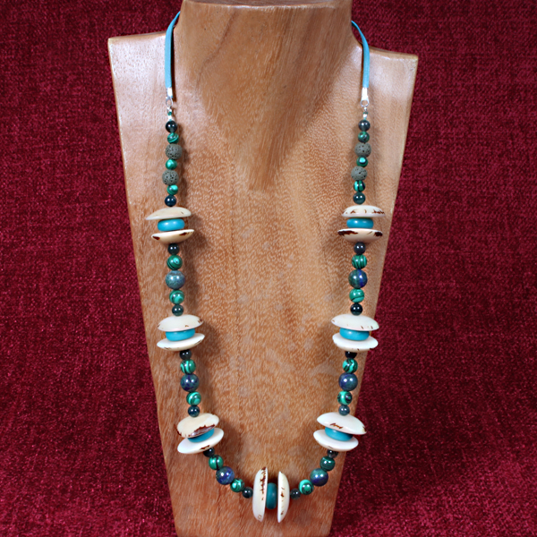18 Lapis Lazuli beads, 6 Abalone Ring beads, 14 Malachite beads, 4 Labradorite beads, 10 Chinese Lotus Jade beads, 3 Turquoise Thick Slice of Tagua Seed beads. Strung on Black Flexi Beading Wire, plus Sterling Silver Toggle Clasp, Split Rings, Cord ends & Crimp beads, finished with Turquoise Coloured Leather Cord endings. |