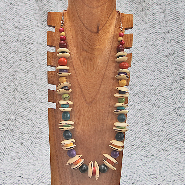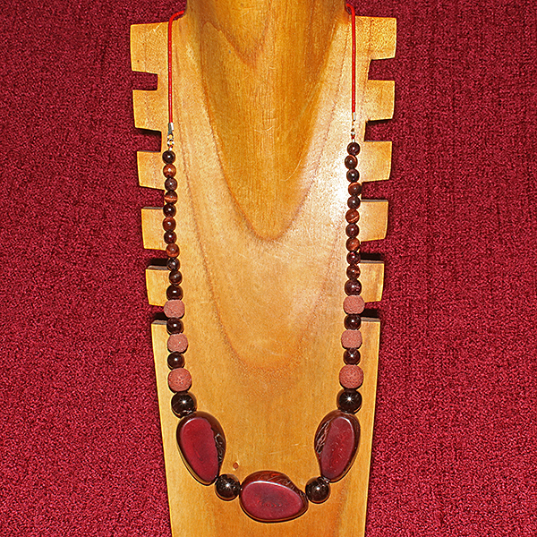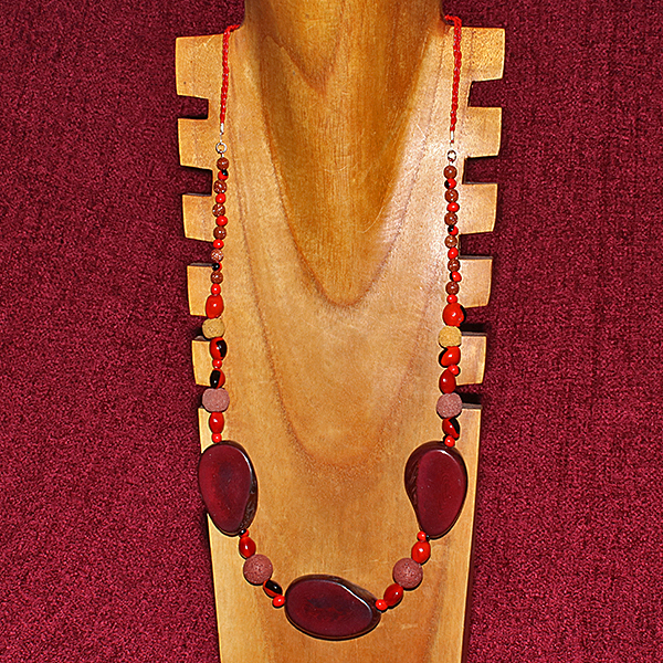 12 Jumbie Eye Seeds, 18 Red Tigers Eye beads, 6 Huaeruro Seed beads, 7 Coloured Thick Slices of Tagua Seed beads. Strung on Red Coloured Flexi Beading Wire, plus Sterling Silver Toggle Clasp, Split Rings, Cord Ends & Crimp beads, finished with Red Coloured Leather Cord Endings. |