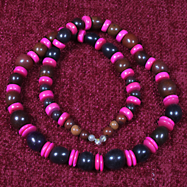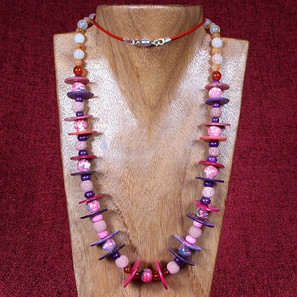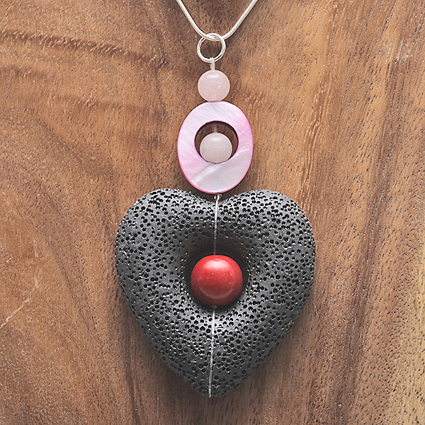 20" Sterling Silver Snake Chain, Sterling Silver Crimp bead and Ring, Acrylic Beading Thread, 2 Rose Quartz beads, 1 Pink Coloured Shell Donut bead, 1 Black Coloured Lava Heart Central, 1 Red Coloured Medium Round Tagua Seed Central bead. |