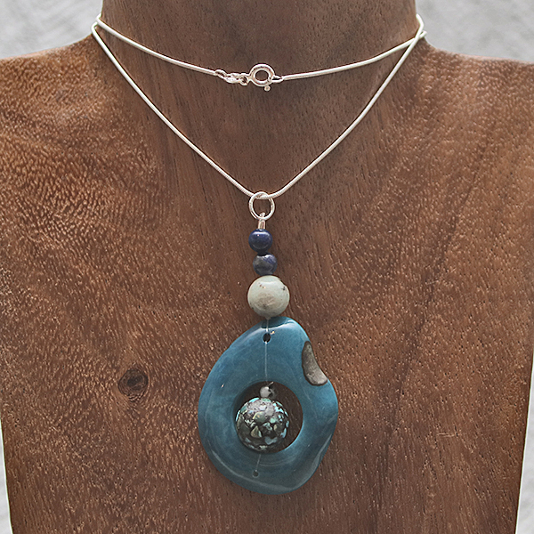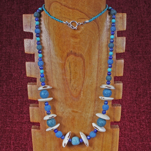 20" Sterling Silver Snake Chain, Sterling Silver Crimp bead and Ring, Acrylic Beading Thread, 2 Lapis Lazuli beads, 2 Chinese Lotus Jade beads in 2 sizes, 1 Turquoise Coloured Tagua Seed Donut Central bead, 1 Vintage possibly Western African Central bead. |