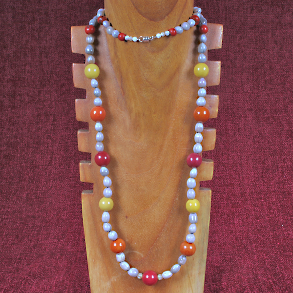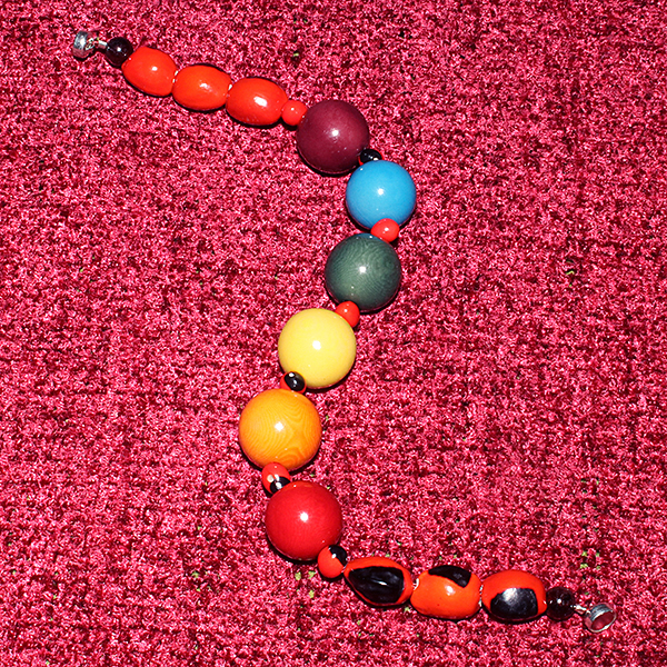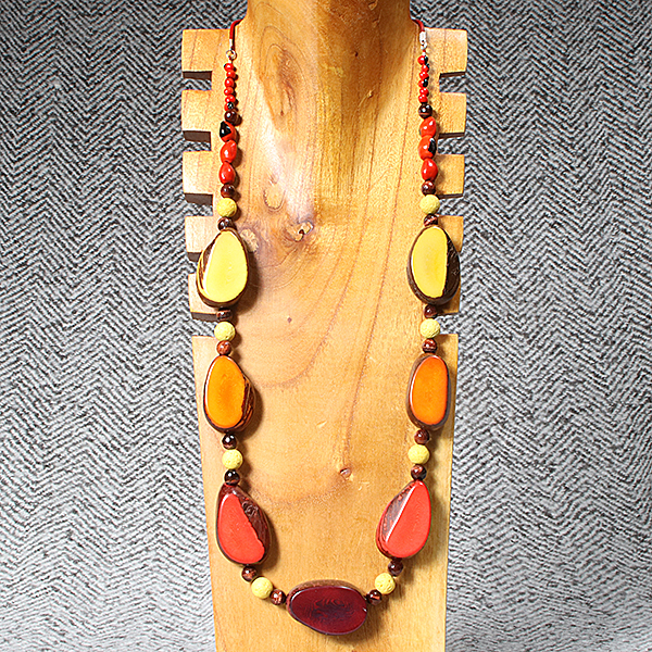 24 Tiny Round Tagua Seed beads in: Dark Red, Red, Orange, Saffron & Yellow colours, 24 Tiny-Small Round Tagua Seed beads in: Dark Red, Red, Orange, Saffron & Yellow colours, 24 Small Round Tagua Seed beads in: Dark Red, Red, Orange, Saffron & Yellow colours, 8 Medium Round Tagua Seed beads in: Dark Red, Red, Orange, Saffron & Yellow colours, 9 Large Round Tagua Seed beads in: Dark Red, Red, Orange, Saffron & Yellow colours. Strung on Red Coloured Flexi Beading Wire, plus Sterling Silver Magnetic Clasp & Crimp beads. |