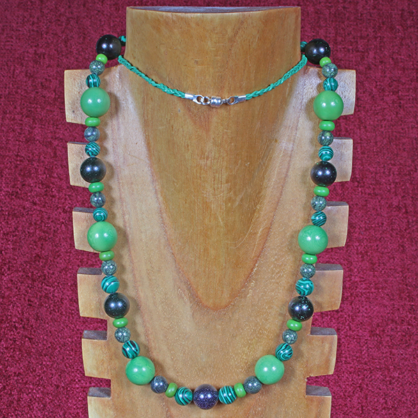 6 Faceted Peridot beads, 22 Dalmatian Jasper beads, 28 Imfibinga Seeds, 6 Malachite beads, 3 Dark Green & 2 Green Coloured Thick Slices of Tagua Seed beads, 4 Ultramarine Coloured Lava beads. Strung on Black Flexi Beading Wire Sterling Silver Toggle Clasp, Split Rings, Cord ends & Crimp beads. |