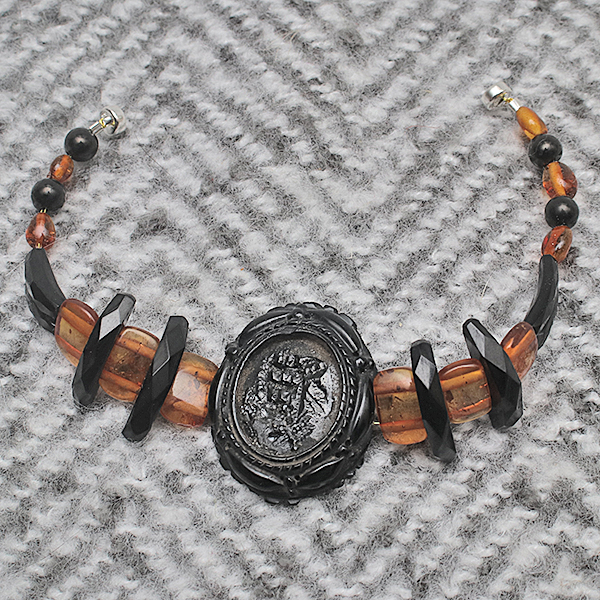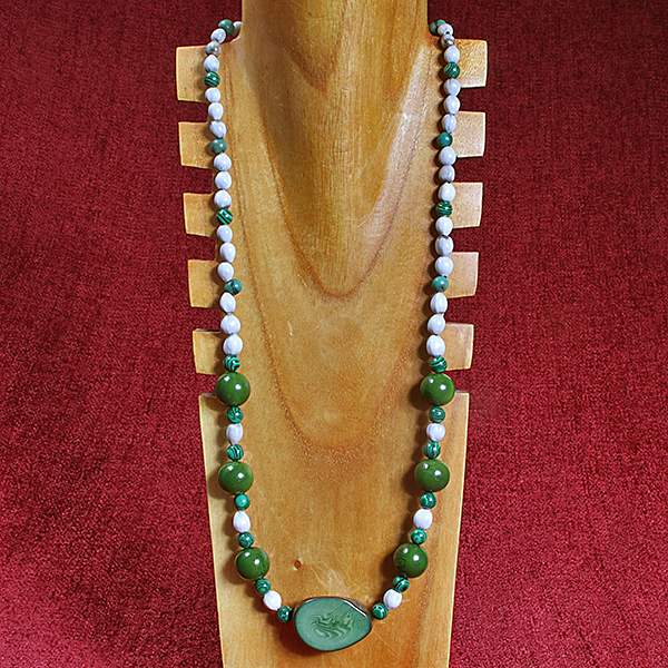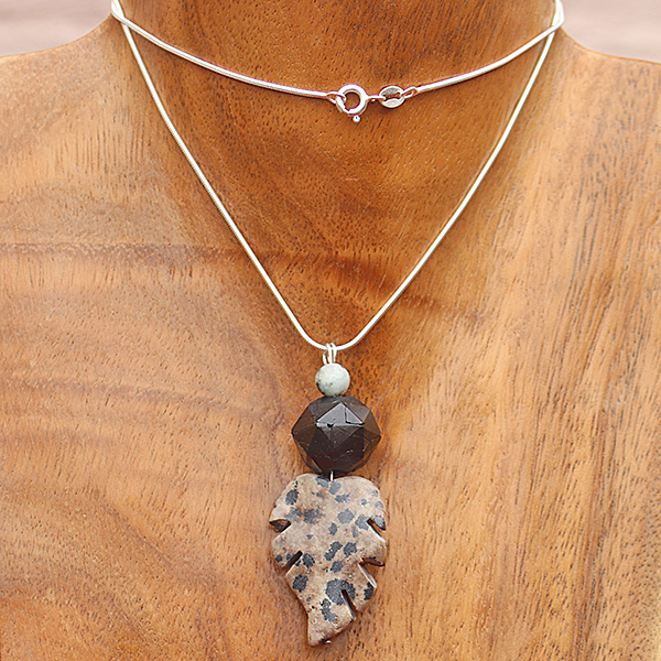 20" Sterling Silver Snake Chain & Head-Pin, 1 Chinese Lotus jade bead, 1 Old Faceted Jett bead, 1 Leaf Carved Dalmatian Jasper Central bead. |