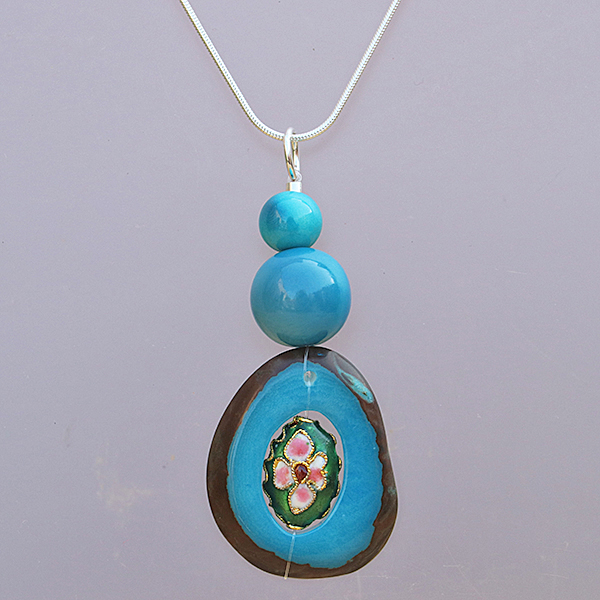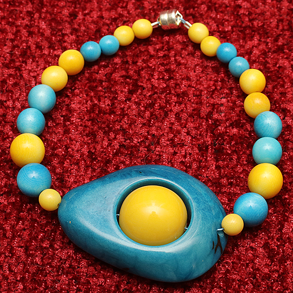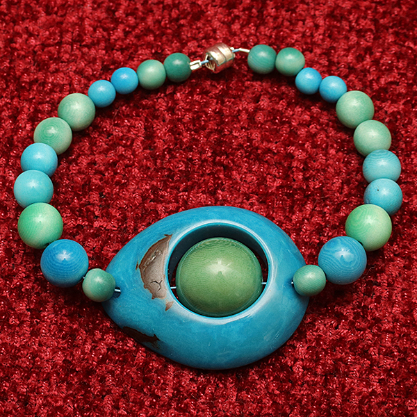 20" Sterling Silver Snake Chain, Sterling Silver Crimp bead and Ring, Acrylic Beading Thread, 2 Turquoise Coloured Round Tagua Seed beads in Small & Medium sizes, 1 Turquoise Coloured Tagua Seed Disc Ring Central bead, 1 Oval Green Cloisonné Central bead. |