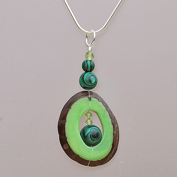 20" Sterling Silver Snake Chain, Sterling Silver Crimp bead and Ring, Acrylic Beading Thread, 3 Peridot beads (2 tiny round and 1 small faceted shapes), 3 Round Malachite beads in graduated sizes, Light Green Coloured Tagua Seed Disc Ring Central bead. |