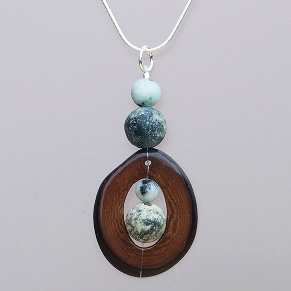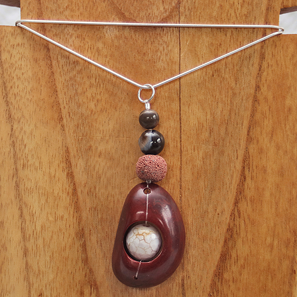 20" Sterling Silver Snake Chain, Sterling Silver Crimp bead and Ring, Acrylic Beading Thread, 1 Petrified Wood agate bead, 1 Coffee Stripe Agate bead, 1 Lava bead, Dark Red Coloured Tagua Seed Donut Central bead, 1 Large Round White & Brown Fire Agate Central bead |