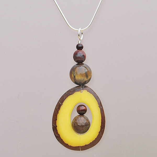 20" Sterling Silver Snake Chain, Sterling Silver Crimp bead and Ring, Acrylic Beading Thread, 3 Red Tiger's Eye beads, 2 Tiger's Eye beads, Yellow Coloured Tagua Seed Disc Ring Central bead. |