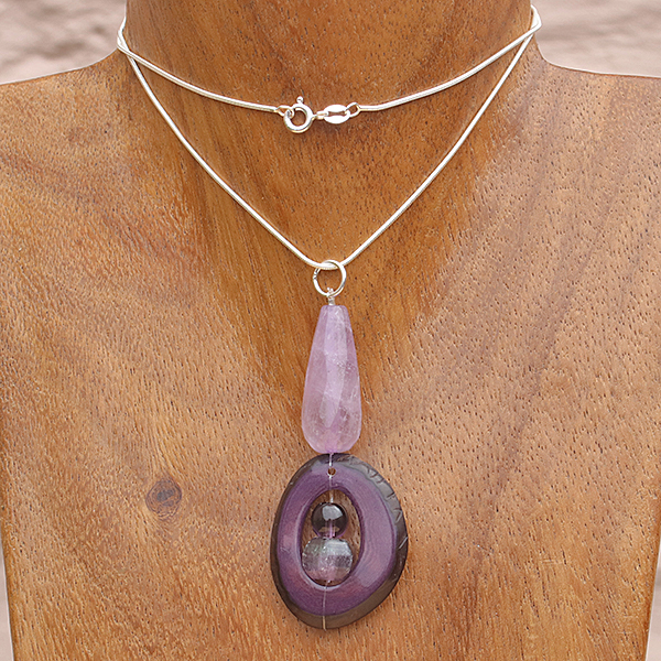 20" Sterling Silver Snake Chain, Sterling Silver Crimp bead and Ring, Acrylic Beading Thread, 1 Large Tear-drop Amethyst bead, Purple Coloured Tagua Seed Disc Ring Central bead, 2 Round Amethyst beads. |