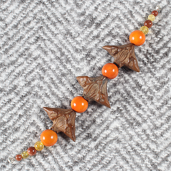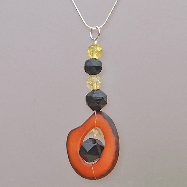 20" Sterling Silver Snake Chain, Sterling Silver Crimp bead and Ring, Acrylic Beading Thread, 3 Round Citrine beads, 3 Faceted Old Jett beads, Orange Coloured Tagua Seed Disc Ring Central bead. |