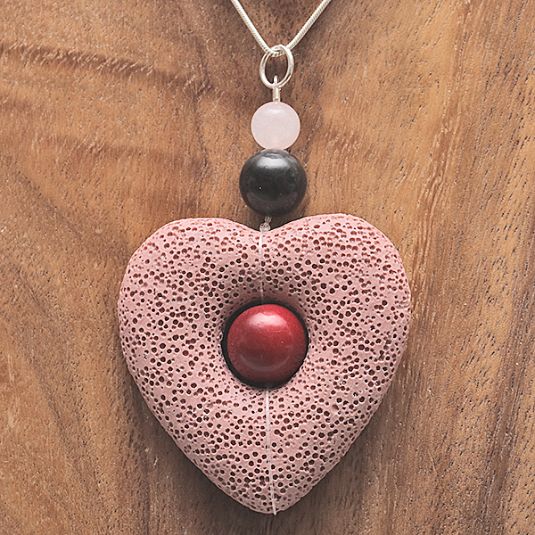 20" Sterling Silver Snake Chain, Sterling Silver Crimp bead and Ring, Acrylic Beading Thread, 1 Rose Quartz bead, 1 Jett bead, 1 Pink Coloured Lava Heart Central, 1 Dark Red Medium Round Tagua Seed Central bead. |