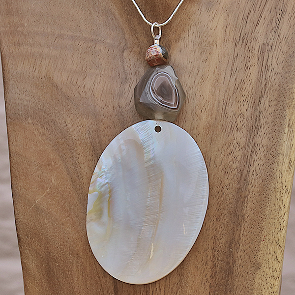 20" Sterling Silver Snake Chain, Sterling Silver Crimp bead and Ring, Acrylic Beading Thread, 1 Faceted Natural Fire Agate bead, 1 Natural Botswana Agate bead, Large Shell Central bead. |