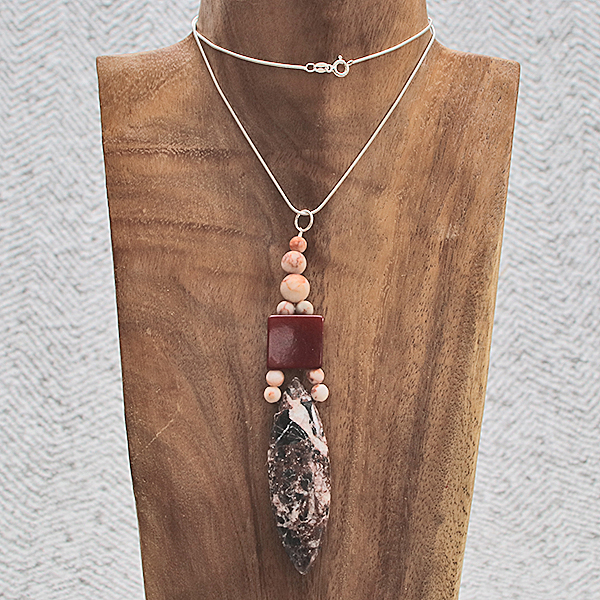 20" Sterling Silver Snake Chain, Sterling Silver Crimp bead and Ring, Acrylic Beading Thread, 9 Natural Netstone beads, 1 Dark Red Coloured Finus Puls Tagua Seed Disc bead, 1 Tapered Rustic Rad Breccia Marble Central bead. |