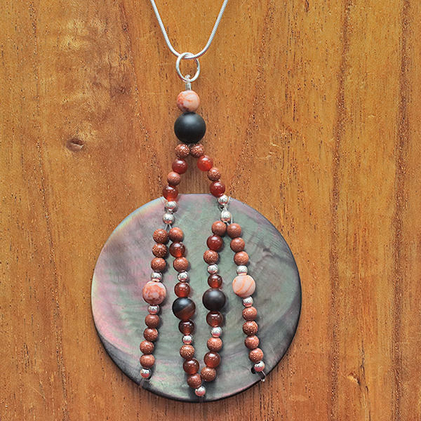 20" Sterling Silver Snake Chain, Sterling Silver Crimp bead, Ring, and 15 Spacer beads, Acrylic Beading Thread, 3 Natural Netstone beads, 3 Madagascan Agate beads, 26 Small Goldstone beads, 12 Small Carnelian beads, 1 Up-cycled Shell Circle Central bead. |