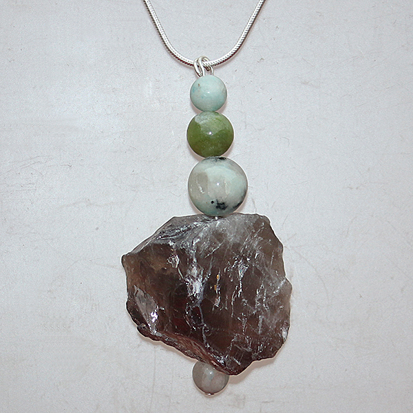 20" Sterling Silver Snake Chain & Head-Pin, 3 Chinese Lotus Jade beads in two different sizes, 1 Natural Butter Jade bead, 1 Smokey Quartz Nugget Central bead. |