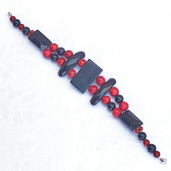 12 Goldstone beads, 20 Jumbie Eye Seeds, 12 Huaeruro Seeds, 6 Lava beads, 3 Wine Thick Slices of Tagua Seed beads. Strung on Red Flexi Beading Wire, plus Sterling Silver Magnetic Clasp, Split Rings, Cord ends & Crimp beads, finished with Red Coloured Plaited Leather Cord endings. |