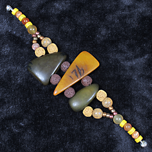 20" Sterling Silver Snake Chain, Sterling Silver Crimp bead and Ring, Acrylic Beading Thread, 1 Citrine bead, 1 Jett bead, 1 White Coloured Lava Heart Central, 1 Zebra Jasper Central bead. |