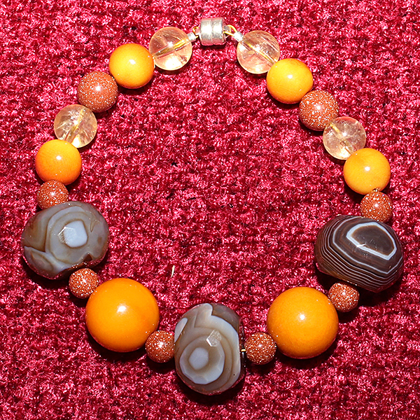 6 Faceted Red Tigers Eye beads, 6 Goldstone beads, 12 Citrine beads, 6 Orange Round Tagua Seed beads, 5 Dark Red Coloured Thick Slices of Tagua Seed beads. Strung on Red Coloured Flexi Beading Wire, plus Sterling Silver Toggle Clasp, Split Rings, Cord Ends & Crimp beads, finished with Red Coloured Leather Cord Endings. |